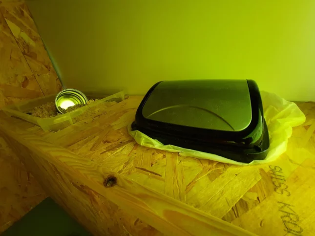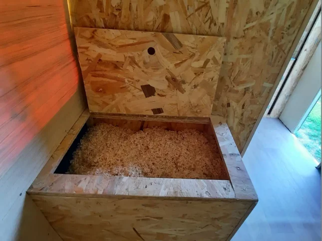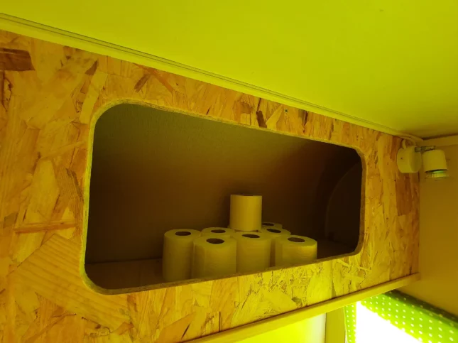 - 1 placard avec les fournitures nécessaire au bon fonctionnement des toilettes sèches : papiers toilette, produit lave-main, sciure de bois et un balai.