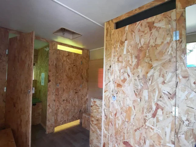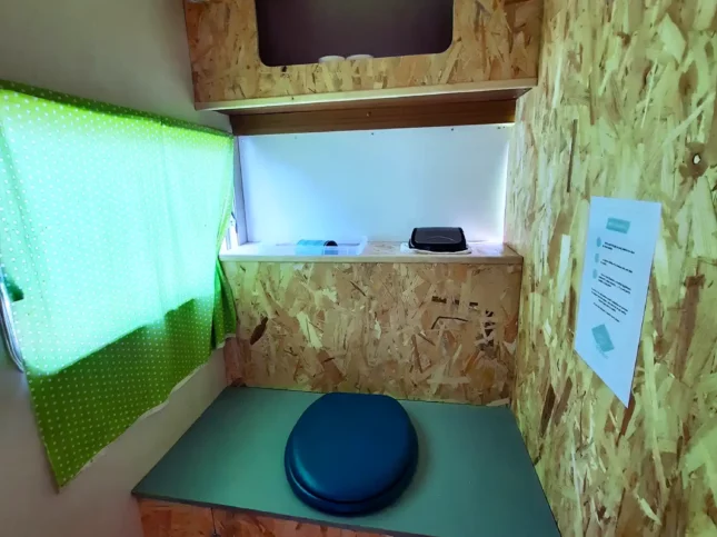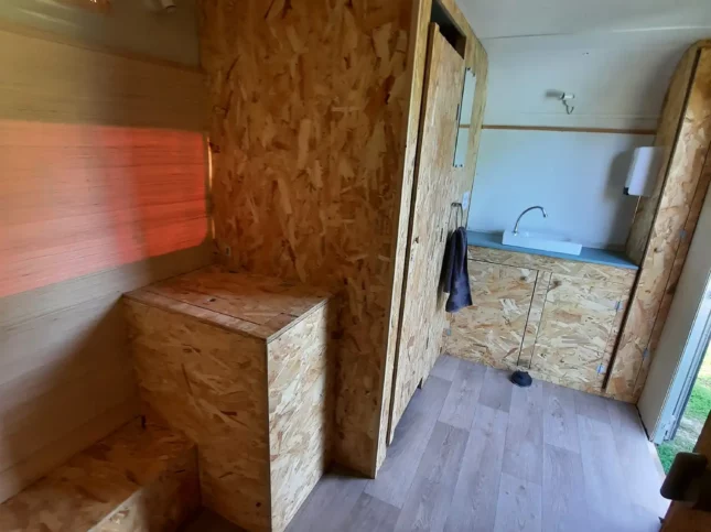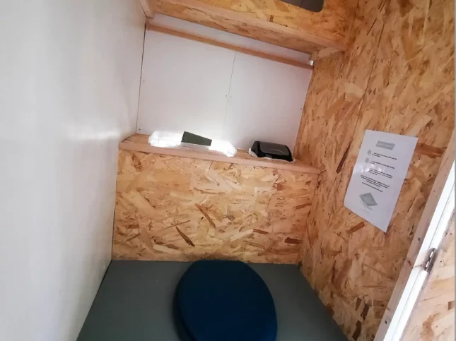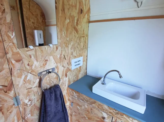 - 3 cabines avec une toilette sèche (équipée d’un porte manteau et d’une réserve de papiers toilette)
