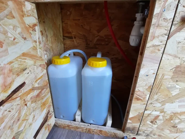 - 1 lavabo connecté à 2 réserves d’eau de 19 litres fonctionnant avec une pompe à pied